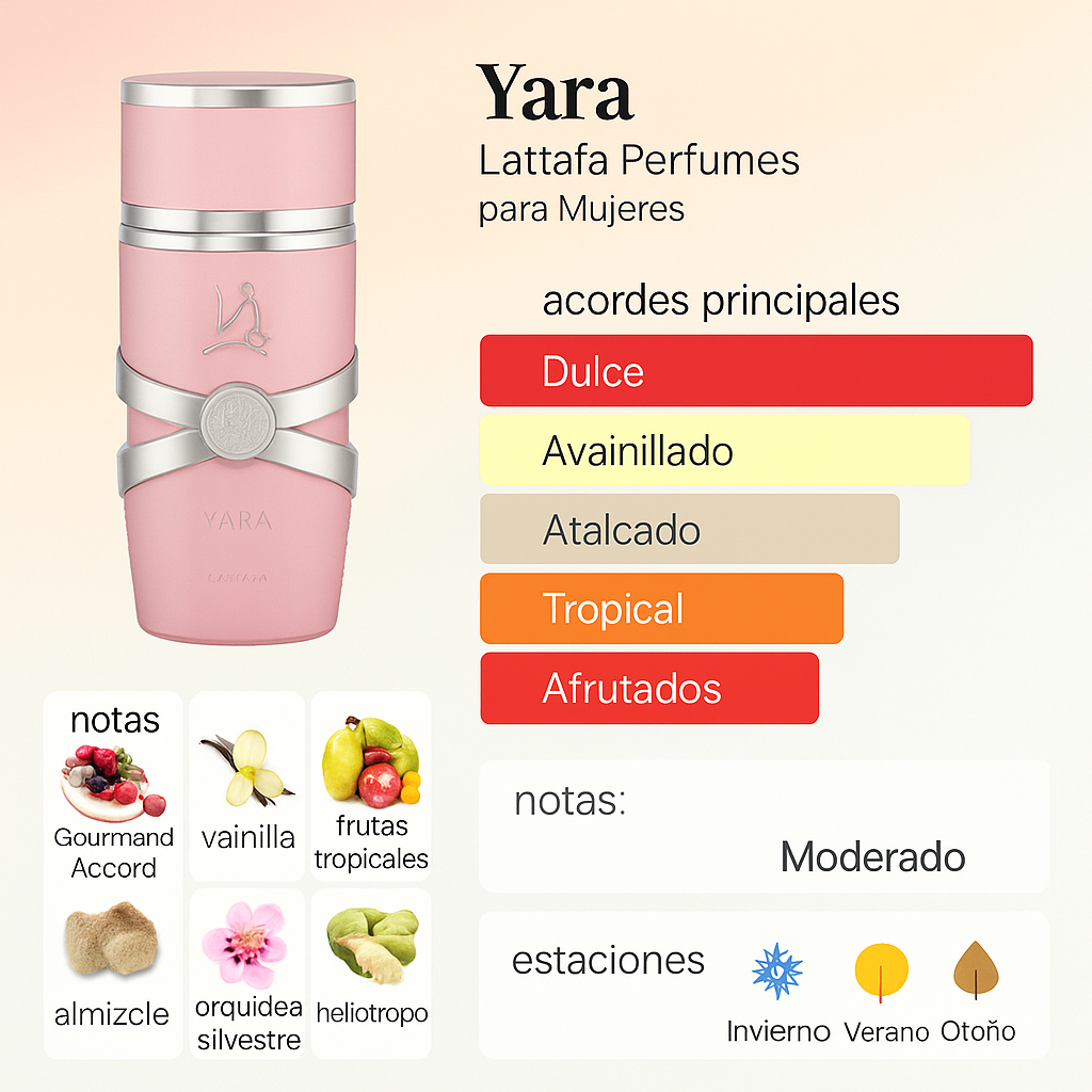 Yara de Lattafa Perfumes es una fragancia de la familia olfativa Oriental Vainilla para Mujeres. Yara se lanzó en 2020. Las Notas de Salida son orquídea, heliotropo y naranja tangerina; las Notas de Corazón son Acuerdo goloso y frutas tropicales; las Notas de Fondo son vainilla, almizcle y sándalo.